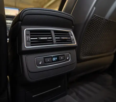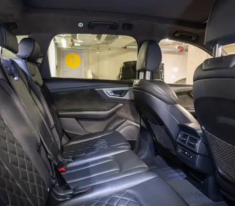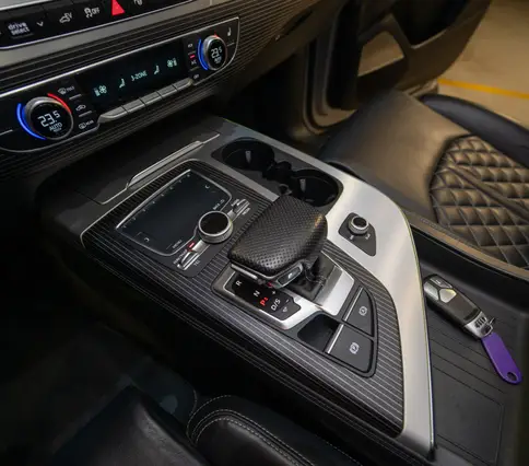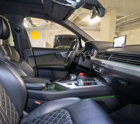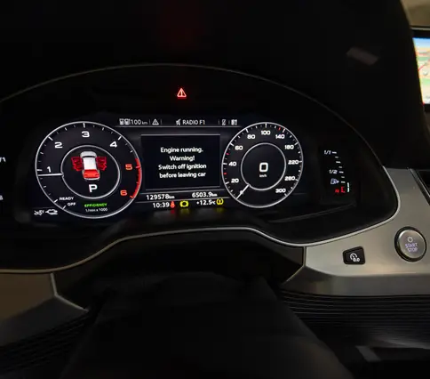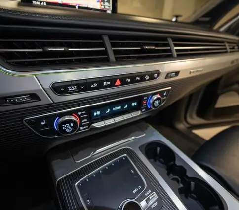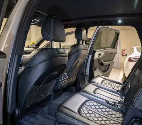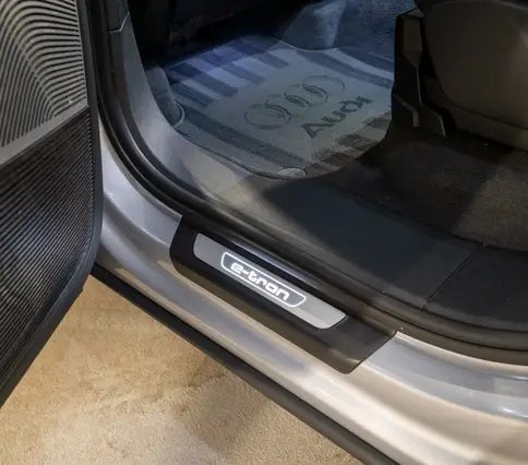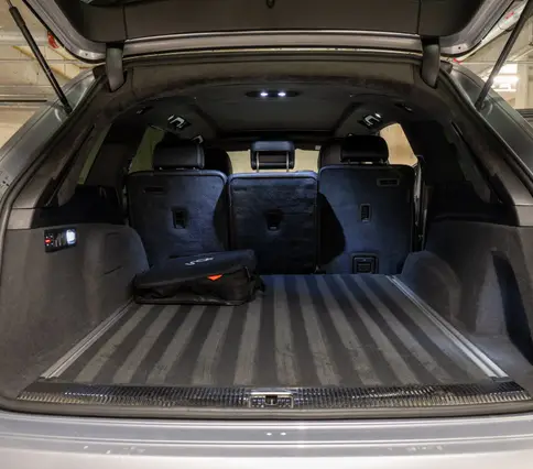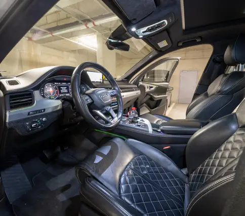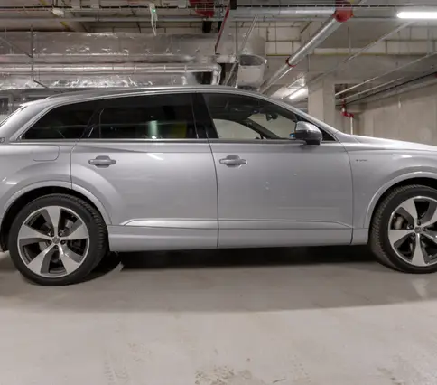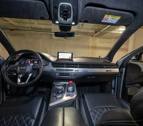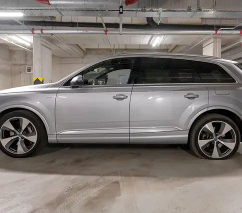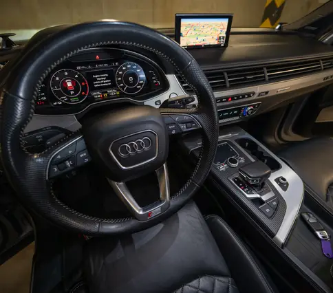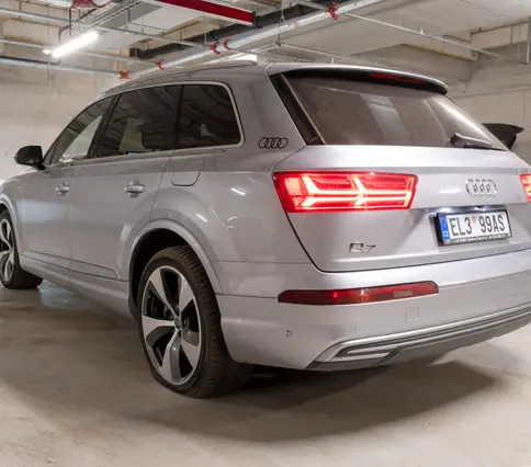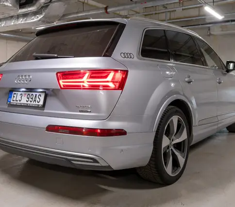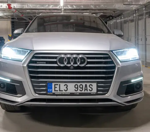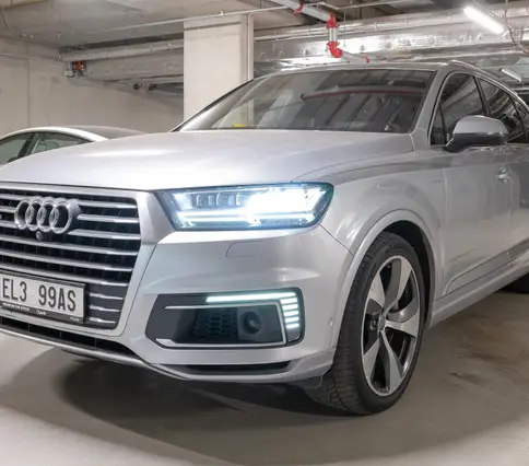 Výbava AUDI Q7 E-TRON 3.0 TDi 190 kW: ABS, ESP, ASR, nouzové brždění, sledování jízdního pruhu, sledování únavy řidiče, aktivní kapota, asistent rozjezdu do kopce, adaptivní tempomat, automatická převodovka 8-stupňová, automatická klimatizace Climatronic, parkovací asistent + senzory, dálkové centrální zamykání, posilovač řízení, kožený sportovní multifunkční volant s pádly řazení, kožené čalounění, palubní počítač, satelitní navigace, Autorádio, Apple car play, Android auto, el. seřiditelná vyhřívaná sedadla, sedadlo řidiče s pamětí, kožené potahy, isofix, střešní okno, automatická uzávěrka diferenciálu, keyless entry.