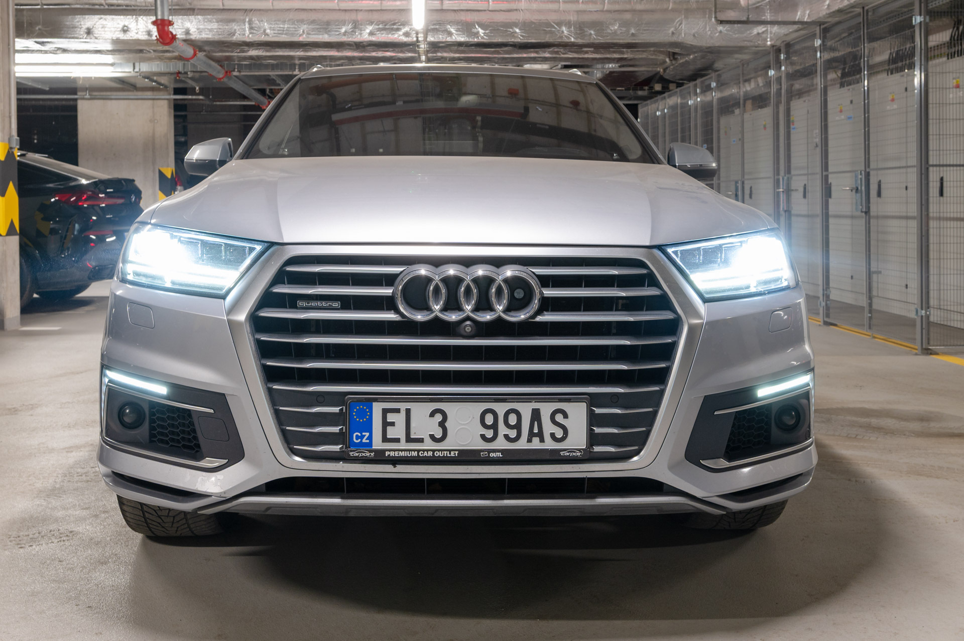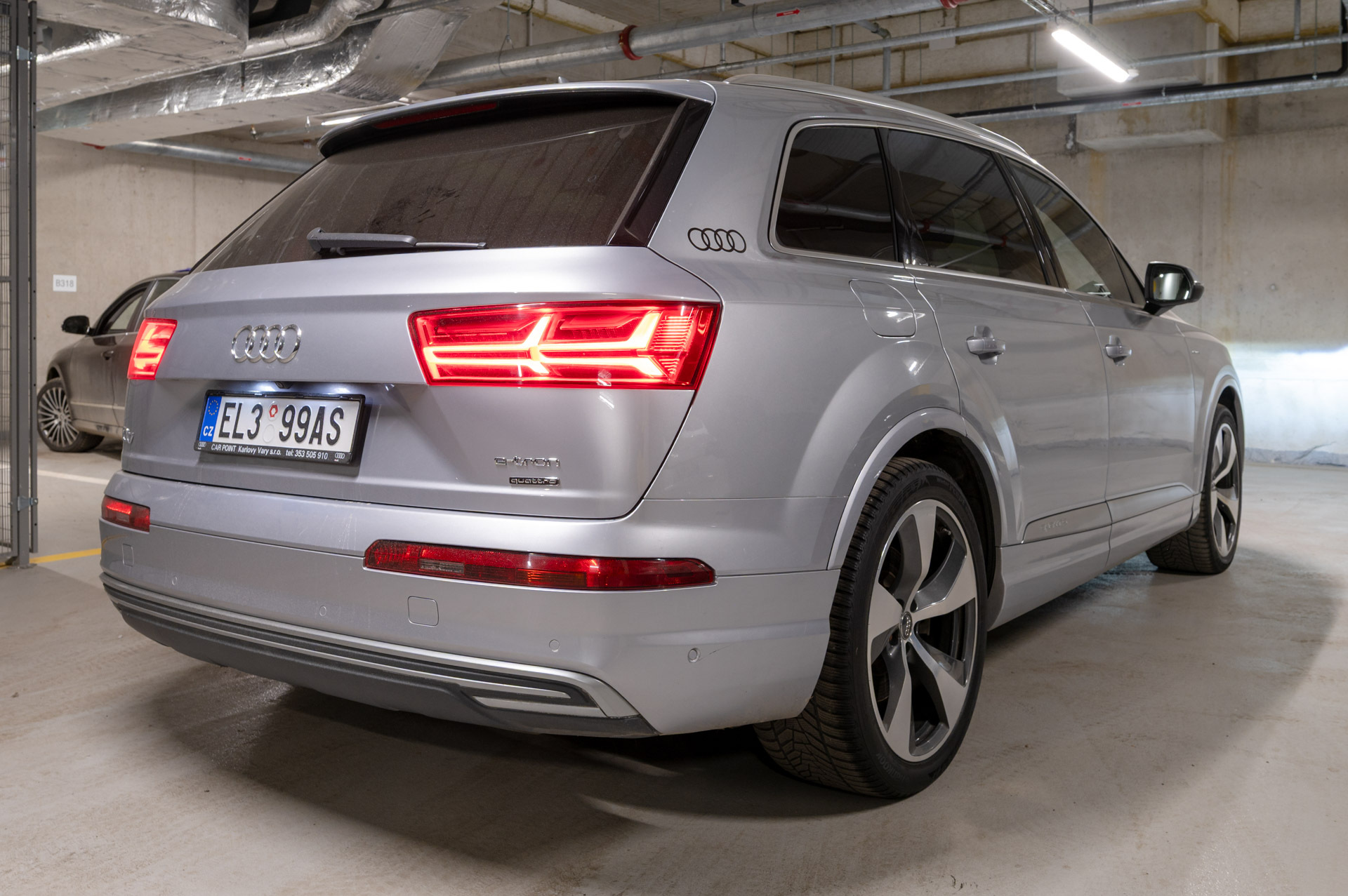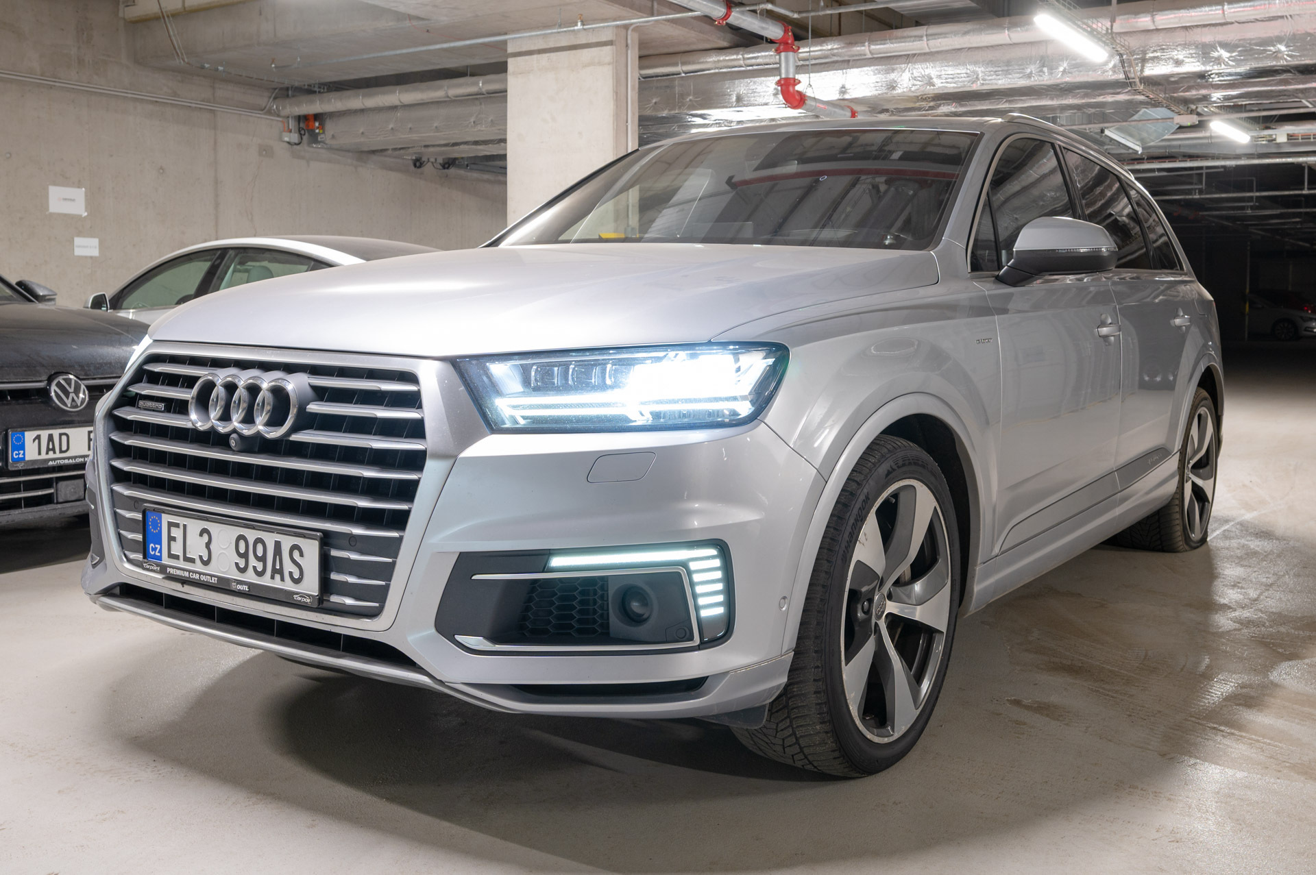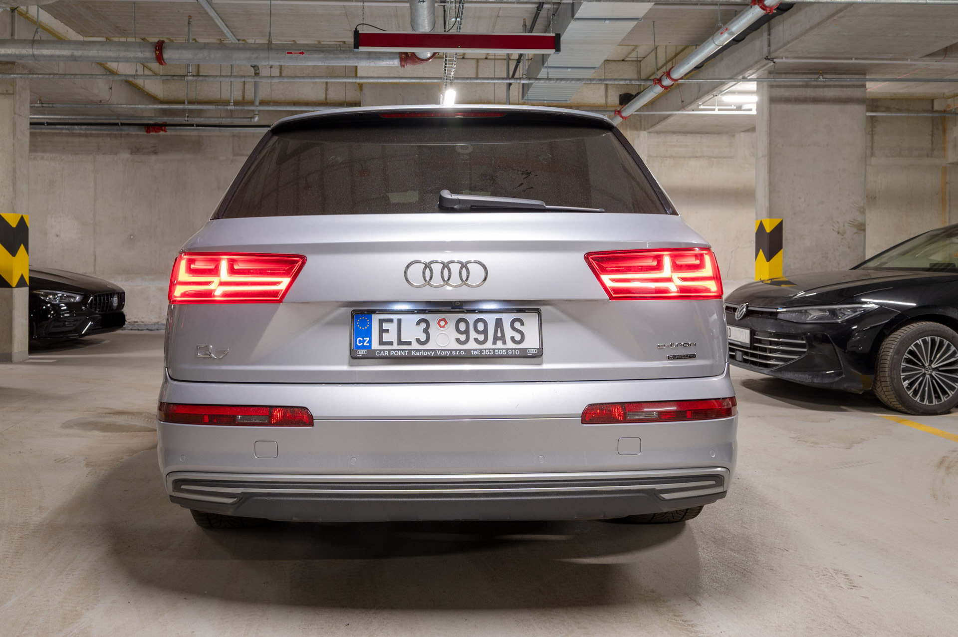 Výbava AUDI Q7 E-TRON 3.0 TDi 190 kW: ABS, ESP, ASR, nouzové brždění, sledování jízdního pruhu, sledování únavy řidiče, aktivní kapota, asistent rozjezdu do kopce, adaptivní tempomat, automatická převodovka 8-stupňová, automatická klimatizace Climatronic, parkovací asistent + senzory, dálkové centrální zamykání, posilovač řízení, kožený sportovní multifunkční volant s pádly řazení, kožené čalounění, palubní počítač, satelitní navigace, Autorádio, Apple car play, Android auto, el. seřiditelná vyhřívaná sedadla, sedadlo řidiče s pamětí, kožené potahy, isofix, střešní okno, automatická uzávěrka diferenciálu, keyless entry.