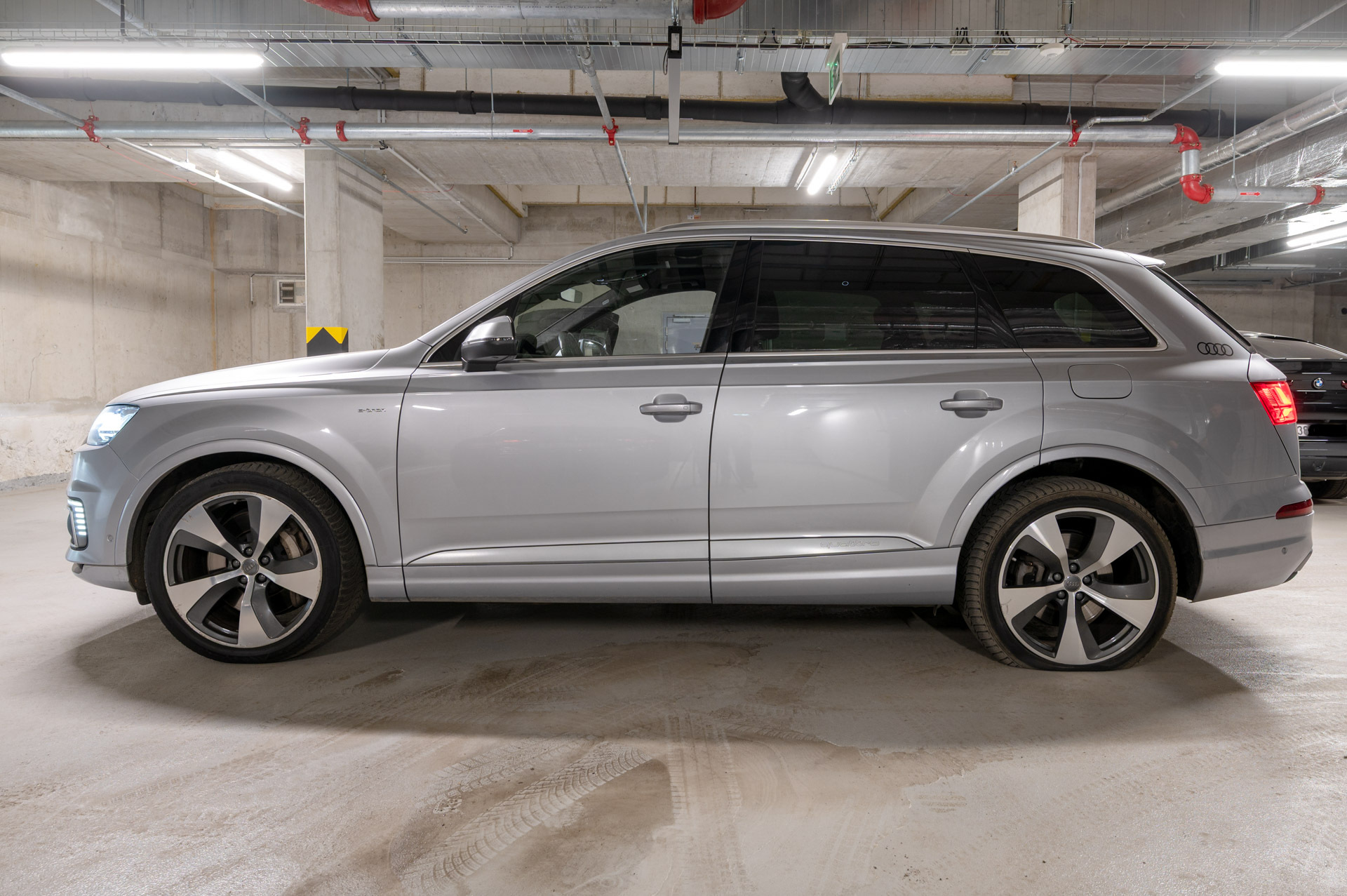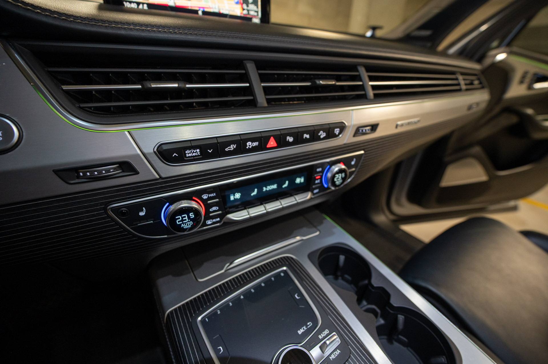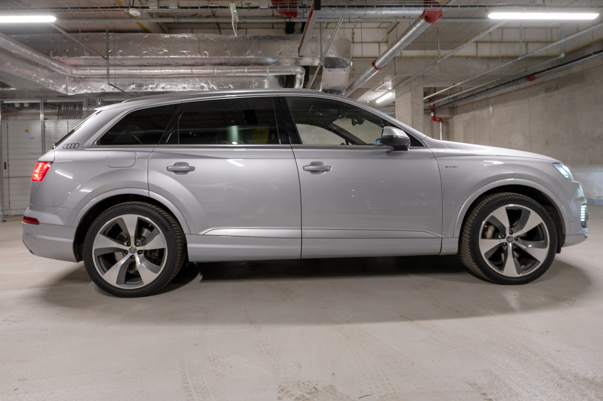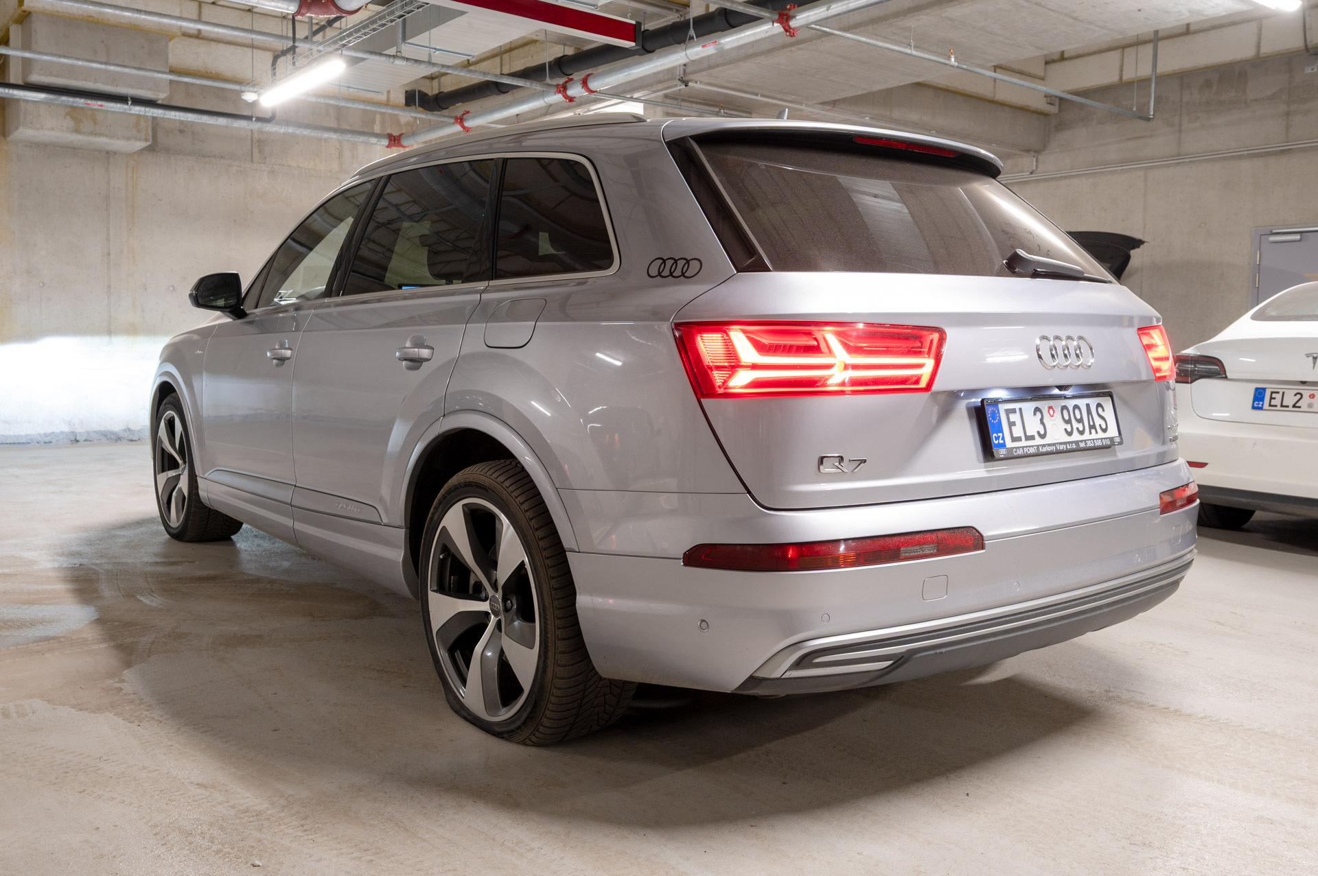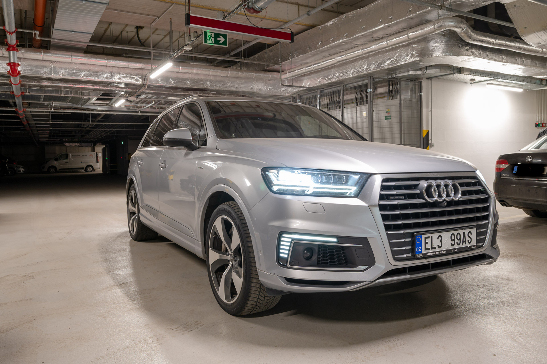 Výbava AUDI Q7 E-TRON 3.0 TDi 190 kW: ABS, ESP, ASR, nouzové brždění, sledování jízdního pruhu, sledování únavy řidiče, aktivní kapota, asistent rozjezdu do kopce, adaptivní tempomat, automatická převodovka 8-stupňová, automatická klimatizace Climatronic, parkovací asistent + senzory, dálkové centrální zamykání, posilovač řízení, kožený sportovní multifunkční volant s pádly řazení, kožené čalounění, palubní počítač, satelitní navigace, Autorádio, Apple car play, Android auto, el. seřiditelná vyhřívaná sedadla, sedadlo řidiče s pamětí, kožené potahy, isofix, střešní okno, automatická uzávěrka diferenciálu, keyless entry.