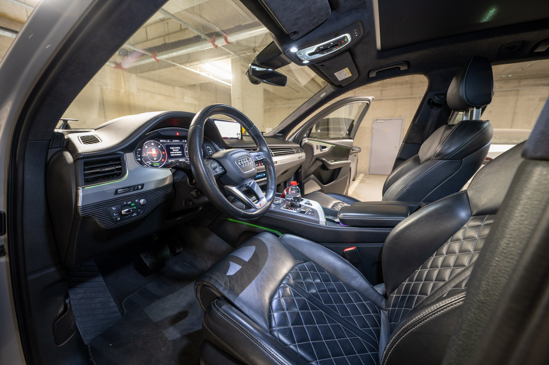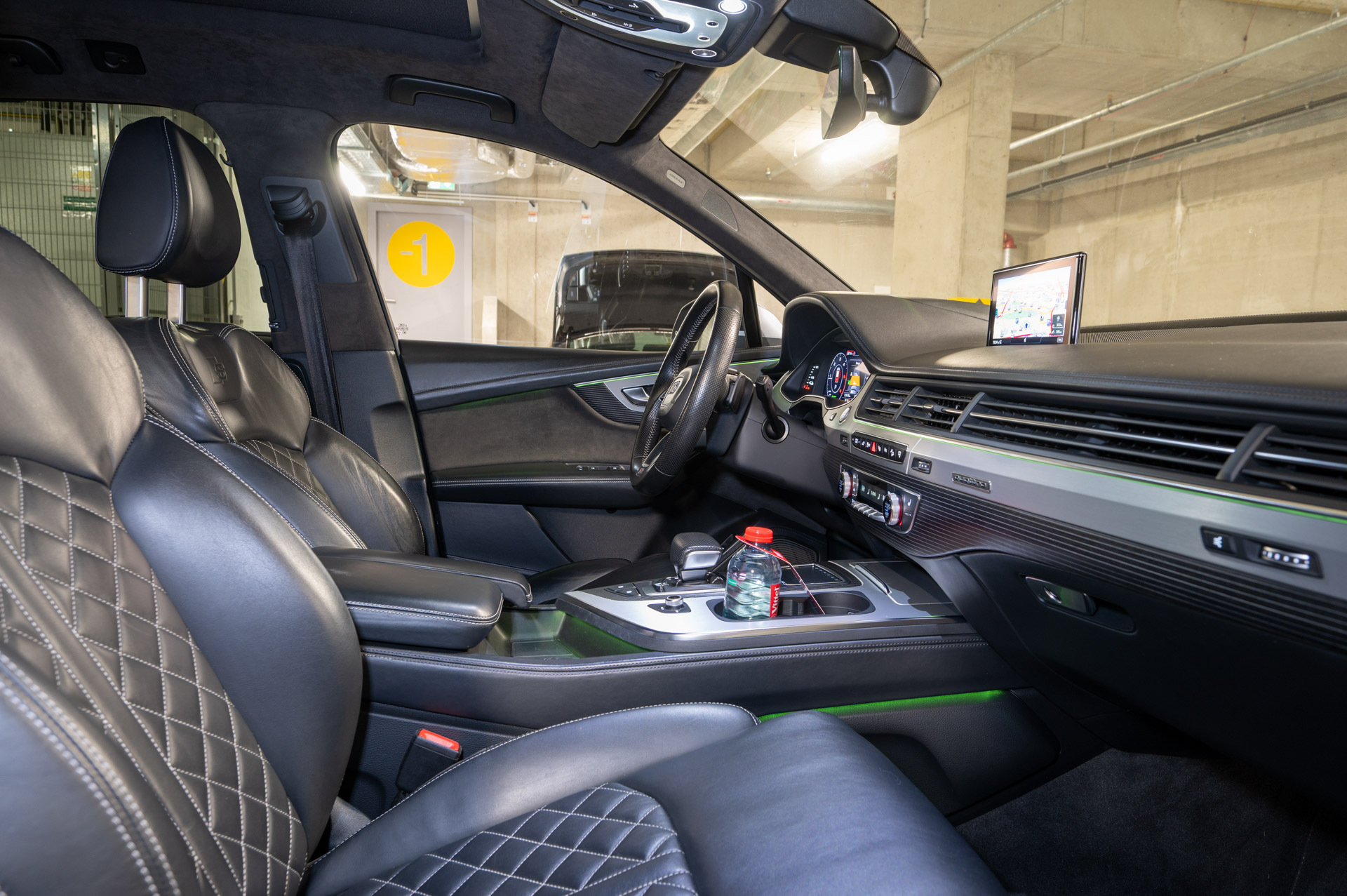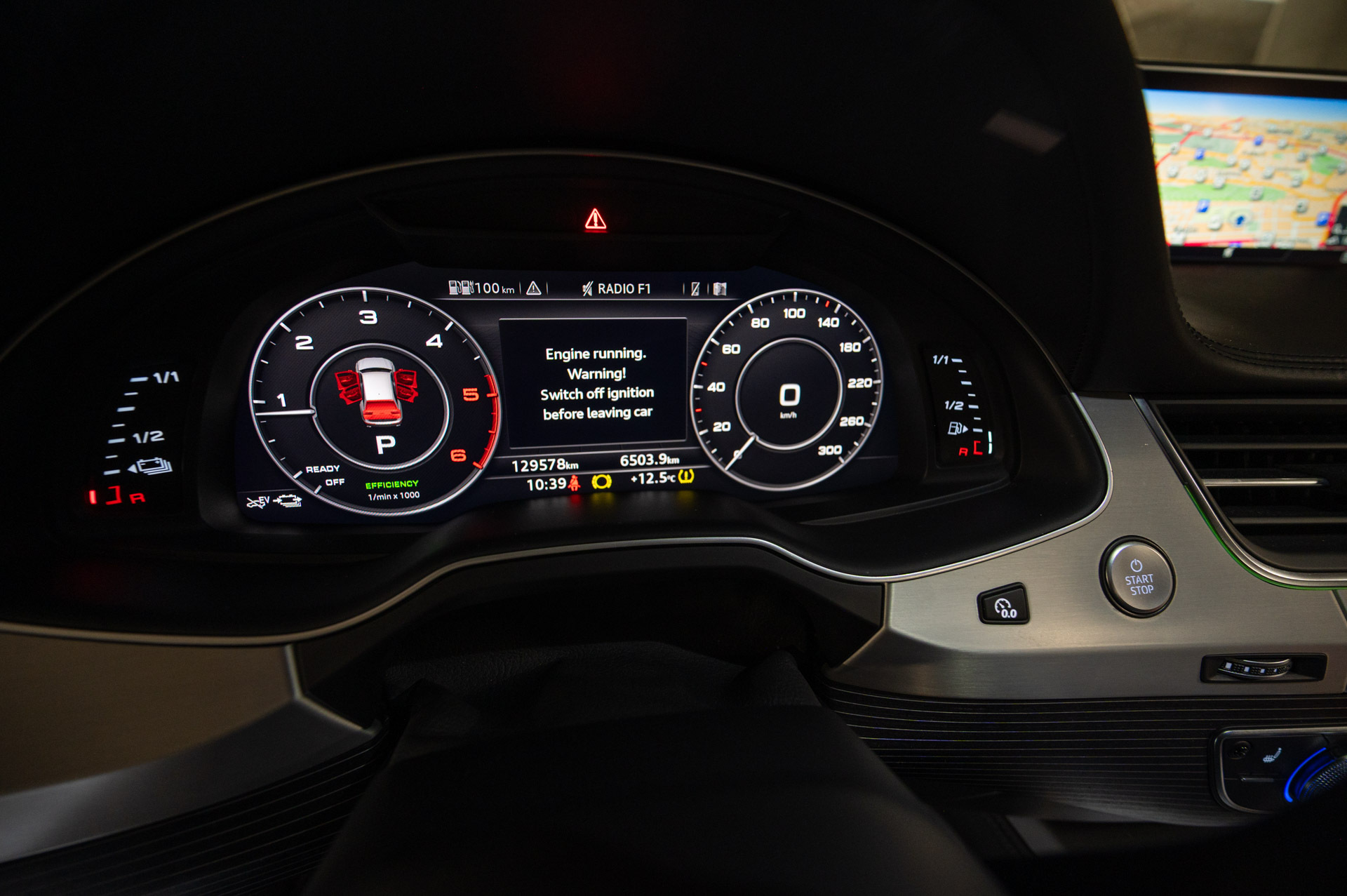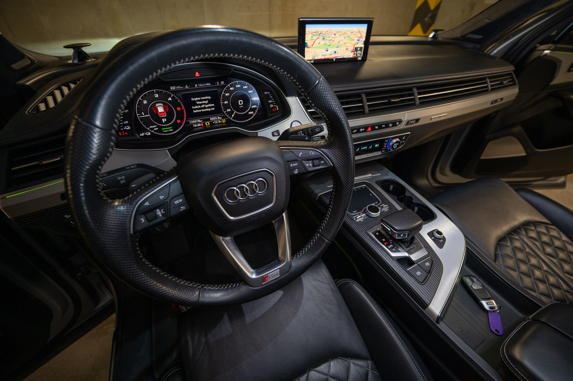 Výbava AUDI Q7 E-TRON 3.0 TDi 190 kW: ABS, ESP, ASR, nouzové brždění, sledování jízdního pruhu, sledování únavy řidiče, aktivní kapota, asistent rozjezdu do kopce, adaptivní tempomat, automatická převodovka 8-stupňová, automatická klimatizace Climatronic, parkovací asistent + senzory, dálkové centrální zamykání, posilovač řízení, kožený sportovní multifunkční volant s pádly řazení, kožené čalounění, palubní počítač, satelitní navigace, Autorádio, Apple car play, Android auto, el. seřiditelná vyhřívaná sedadla, sedadlo řidiče s pamětí, kožené potahy, isofix, střešní okno, automatická uzávěrka diferenciálu, keyless entry.