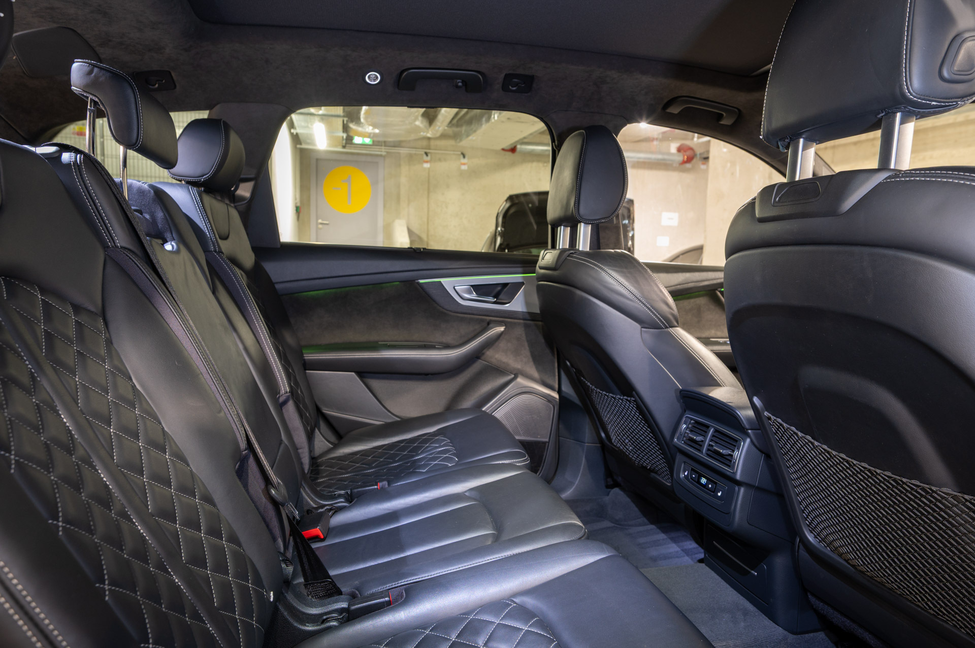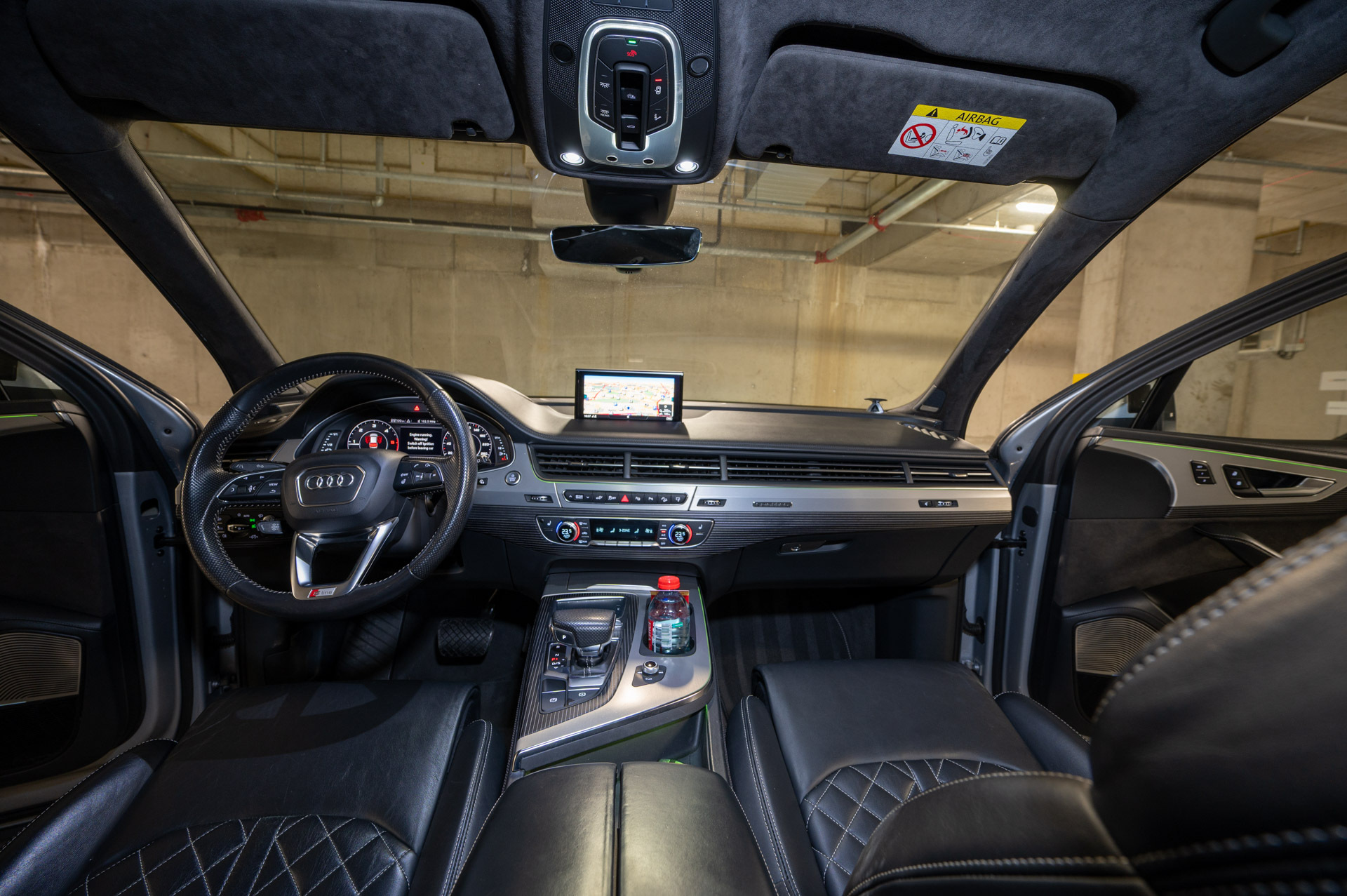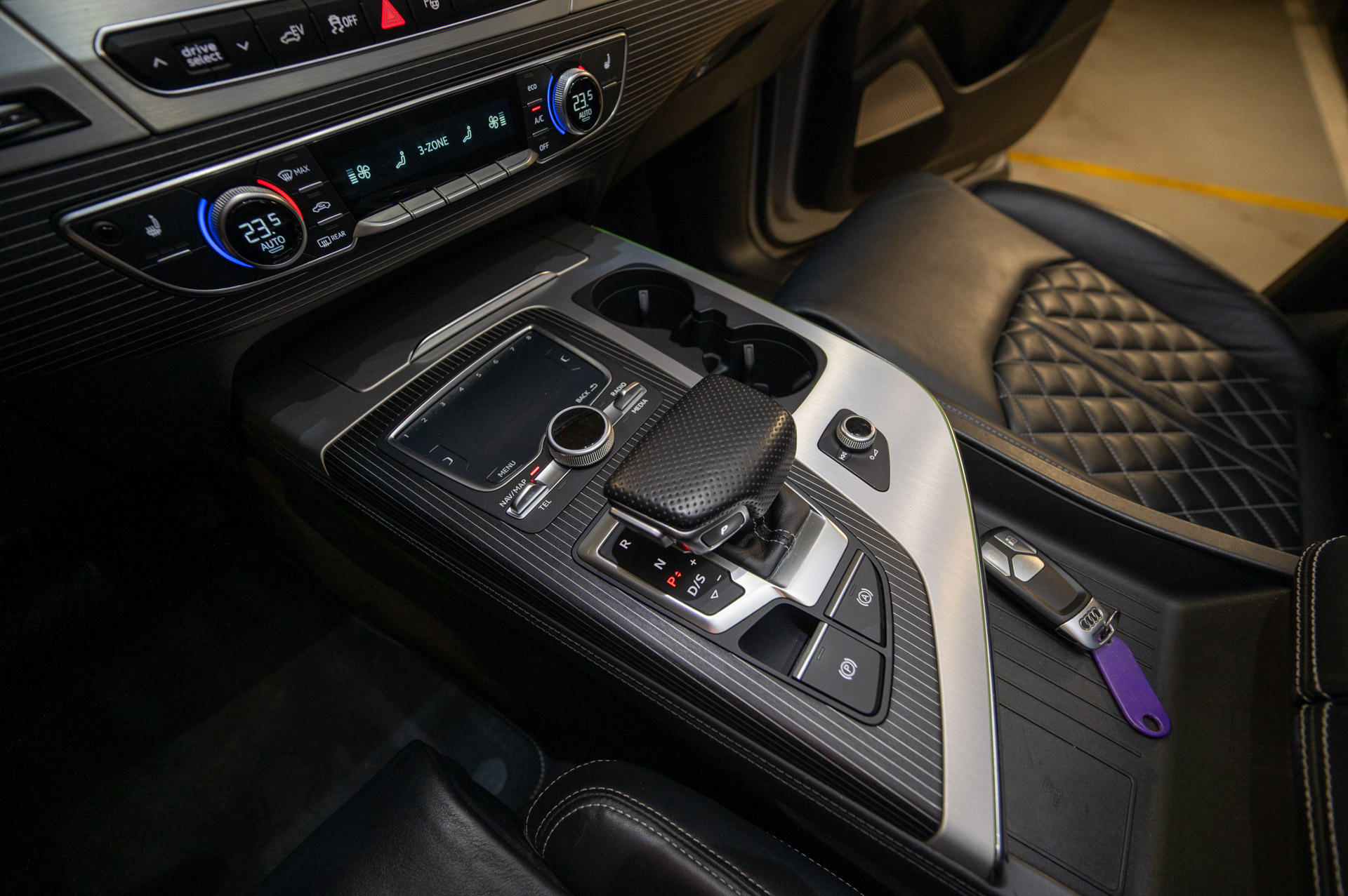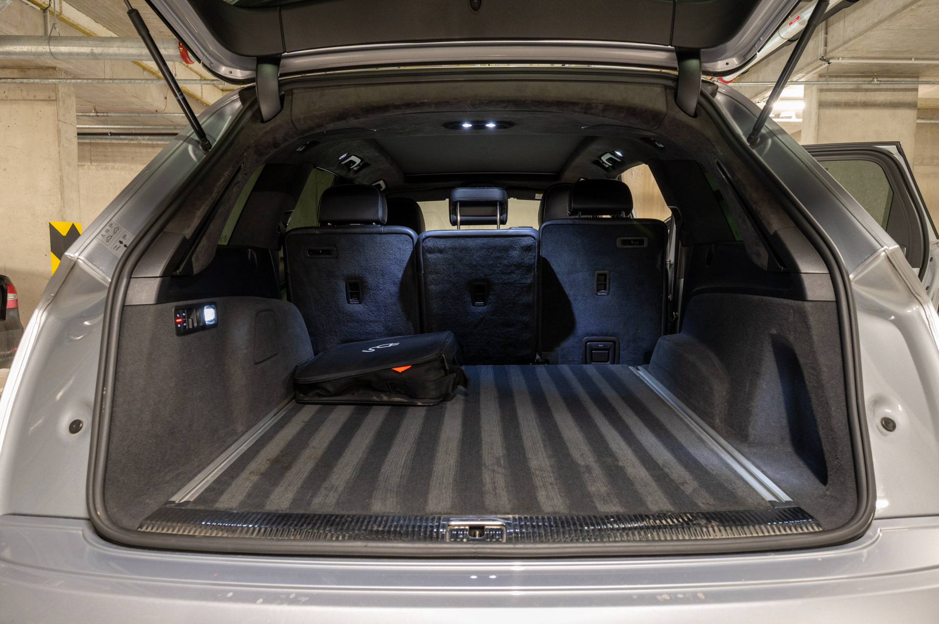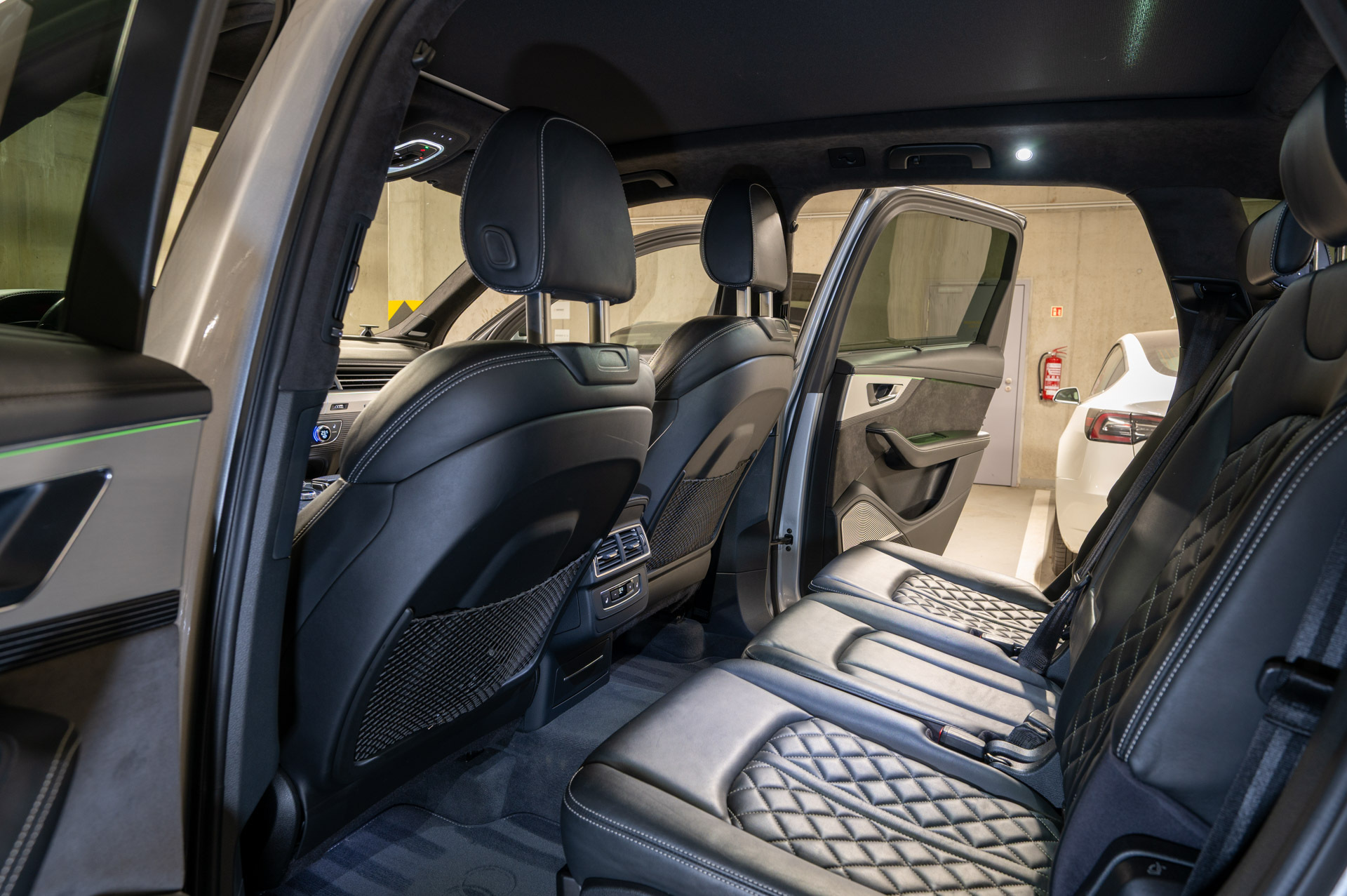 Výbava AUDI Q7 E-TRON 3.0 TDi 190 kW: ABS, ESP, ASR, nouzové brždění, sledování jízdního pruhu, sledování únavy řidiče, aktivní kapota, asistent rozjezdu do kopce, adaptivní tempomat, automatická převodovka 8-stupňová, automatická klimatizace Climatronic, parkovací asistent + senzory, dálkové centrální zamykání, posilovač řízení, kožený sportovní multifunkční volant s pádly řazení, kožené čalounění, palubní počítač, satelitní navigace, Autorádio, Apple car play, Android auto, el. seřiditelná vyhřívaná sedadla, sedadlo řidiče s pamětí, kožené potahy, isofix, střešní okno, automatická uzávěrka diferenciálu, keyless entry.