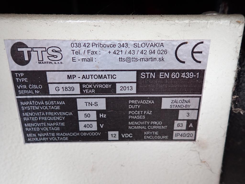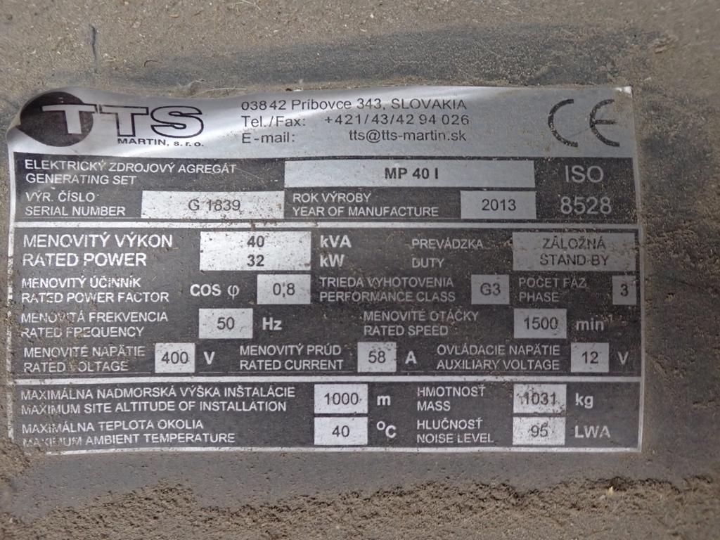 Značka a typ TTS Martin, MP 40 I, Druh stroje motorgenerátor řady standard, Výrobce stroje TTS Martin, Výrobní číslo stroje / rok výroby G 1839 / 2013, Pohon - druh motoru, palivo vznětový motor, NM, Typ motoru F5CE0455A, Výrobní číslo motoru 117521, Elektrický generátor typ SK 160 WB, Výrobce el. generátoru Sincro, Výrobní číslo B112223, Základní výkon 40 kVA / 32 kW, Napětí 400 V / 230 V, Jmenovitý proud 58 A, Hmotnost stroje 745 kg, Rozměry délka x šířka x výška 1665 x 700 x 1270 mm, Řídící panel Automatic AMF 5, InteliLite, Rozměry vč. kapotáže délka x šířka x výška 1825 x 930 x 1352 mm