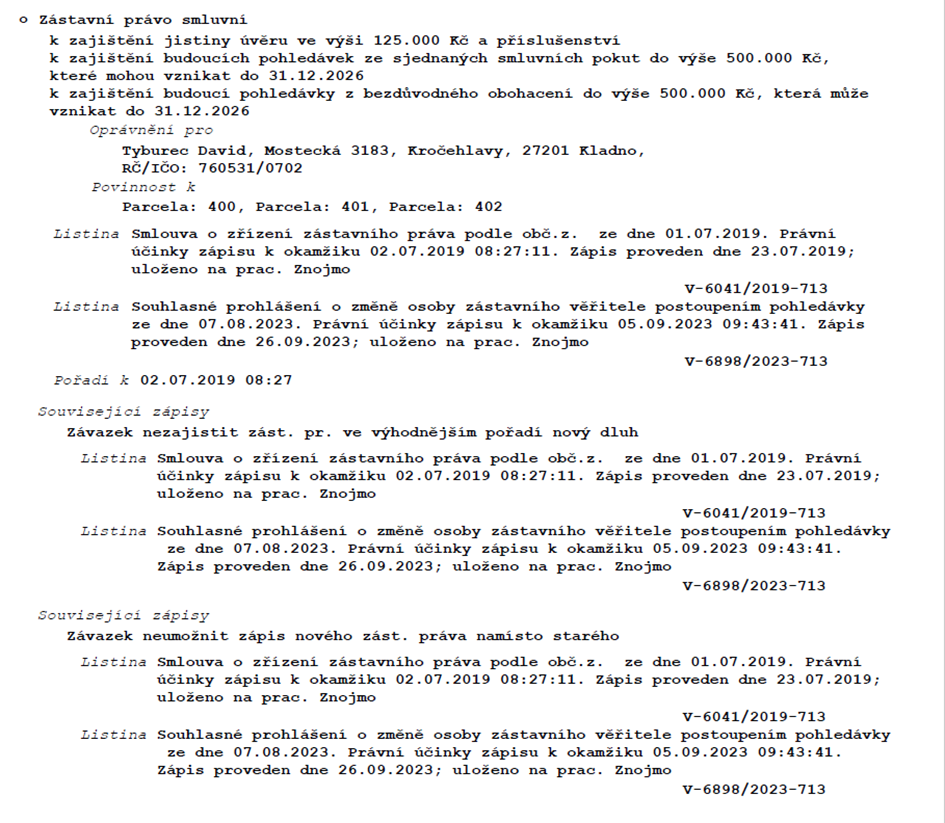 Ke dni vkladu do katastru nemovitostí a předáním Předmětu dražby přecházejí na stranu kupující vlastnická práva k Předmětu dražby. Vydražitel je oprávněn Předmět dražby užívat a brát z nich užitky, provádět na něm svým jménem opravy a údržbu a vystupovat v jeho souvislosti ve správních a jiných řízeních svým jménem.